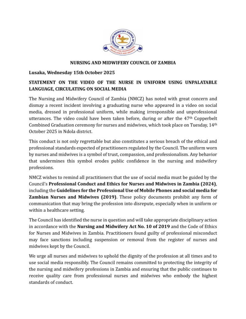 The incident occurred during the 47th Copperbelt Combined Graduation ceremony on October 14, 2025, where Lisa was filmed performing while wearing her nursing uniform. In the video, she rapped lyrics from Kanye West’s “Good Morning” and shouted “Nyuuu” in what NMCZ deemed unprofessional conduct.